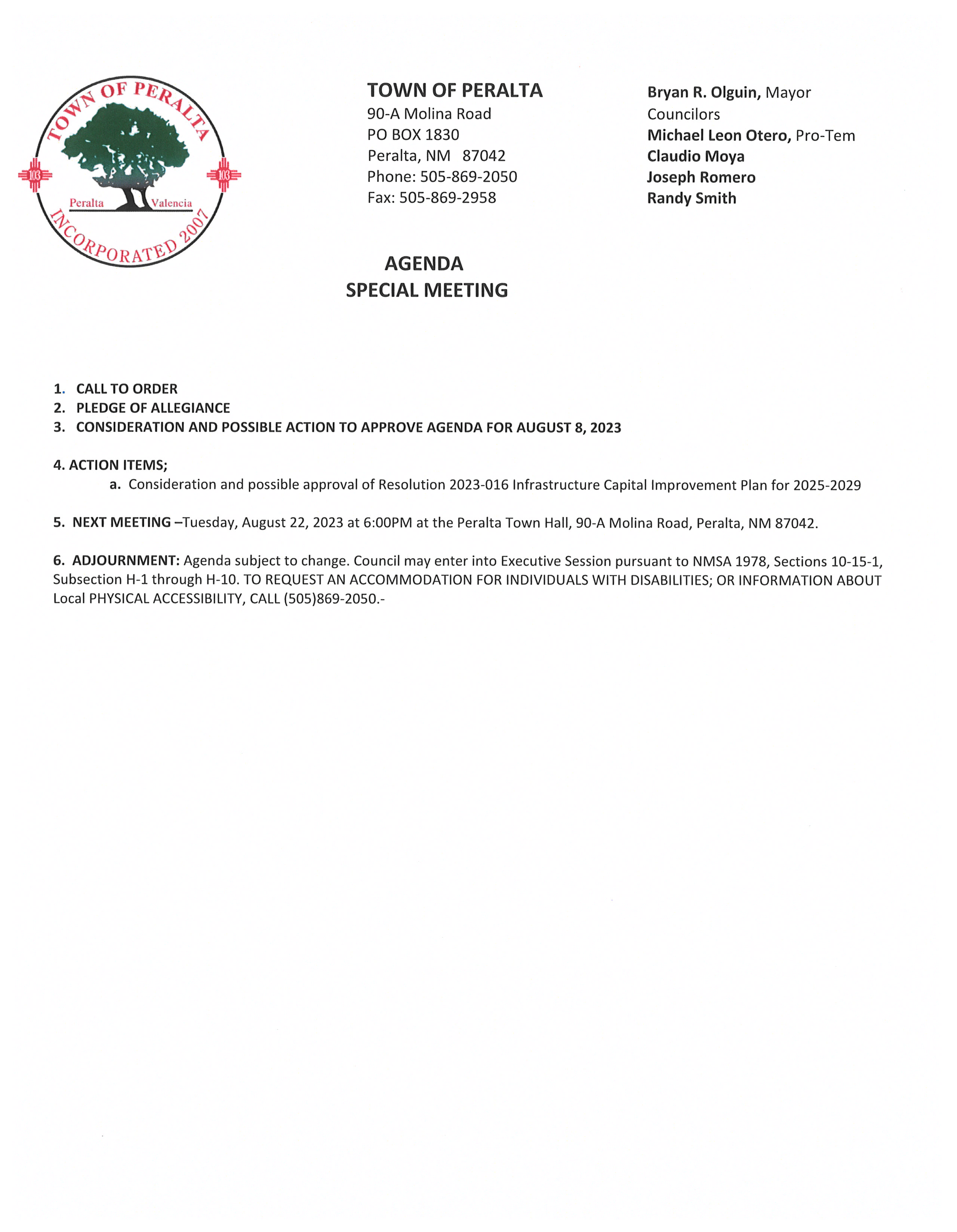 Special meeting 8/8/23 at 9:00AM